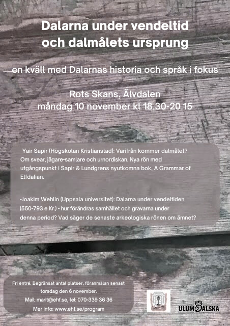 Dalarna under vendeltid och dalmålets ursprung en kväll med Dalarnas historia och språk i fokus. Rots Skans, måndag 10 november kl 18.30-20.15